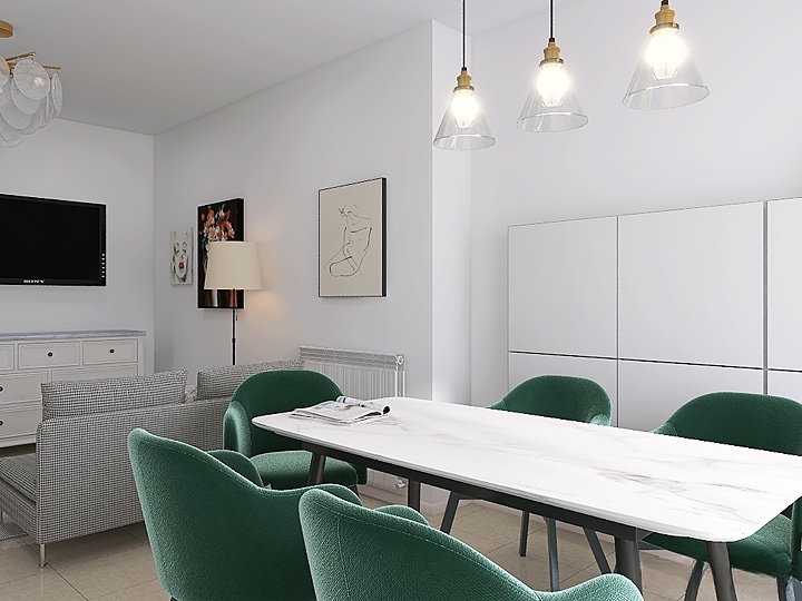 Questo progetto ha avuto come punto di partenza gli elementi già amati dalla proprietaria: le sedie in velluto verde, che desiderava mantenere per il loro valore affettivo. Anche la cucina, acquistata prima dell’inizio dei lavori, è stata integrata nel progetto con il mio supporto, valorizzandone il design e la funzionalità.